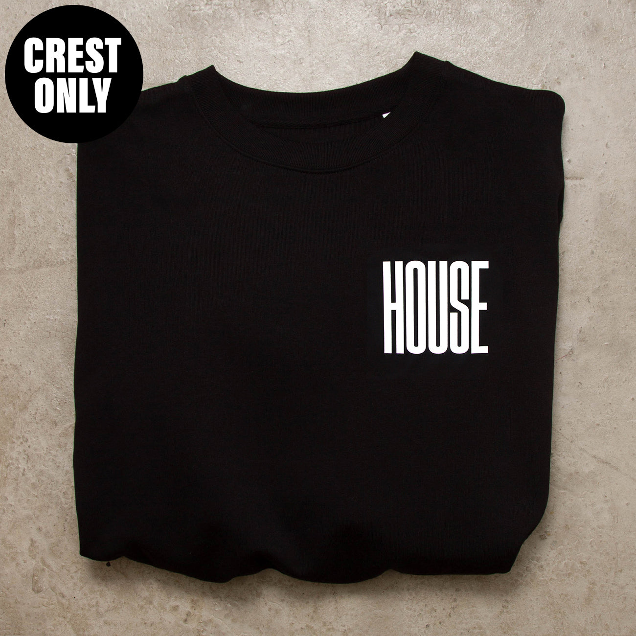 House Music All Night Long. The typography Higher House Sweatshirt. Large back print graphic with small front crest. Screen-printed in-house by us on a unisex heavy-weight 100% Organic Cotton sweatshirt (350gsm) using environmentally friendly water-based inks.
