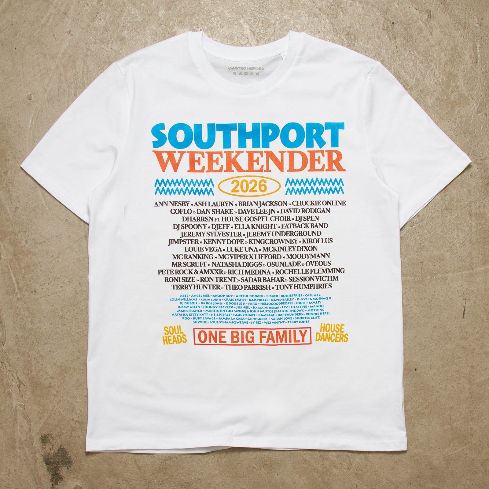 We’re super excited to be collaborating with the institution that is Southport Weekender. The festival is now in its fourth decade, and we hope we’ve done the merchandise justice. We’ll be heading down for the weekend to host a pop-up shop, selling merch and experiencing what we’ve been told is the friendliest festival on earth. One Big Family!