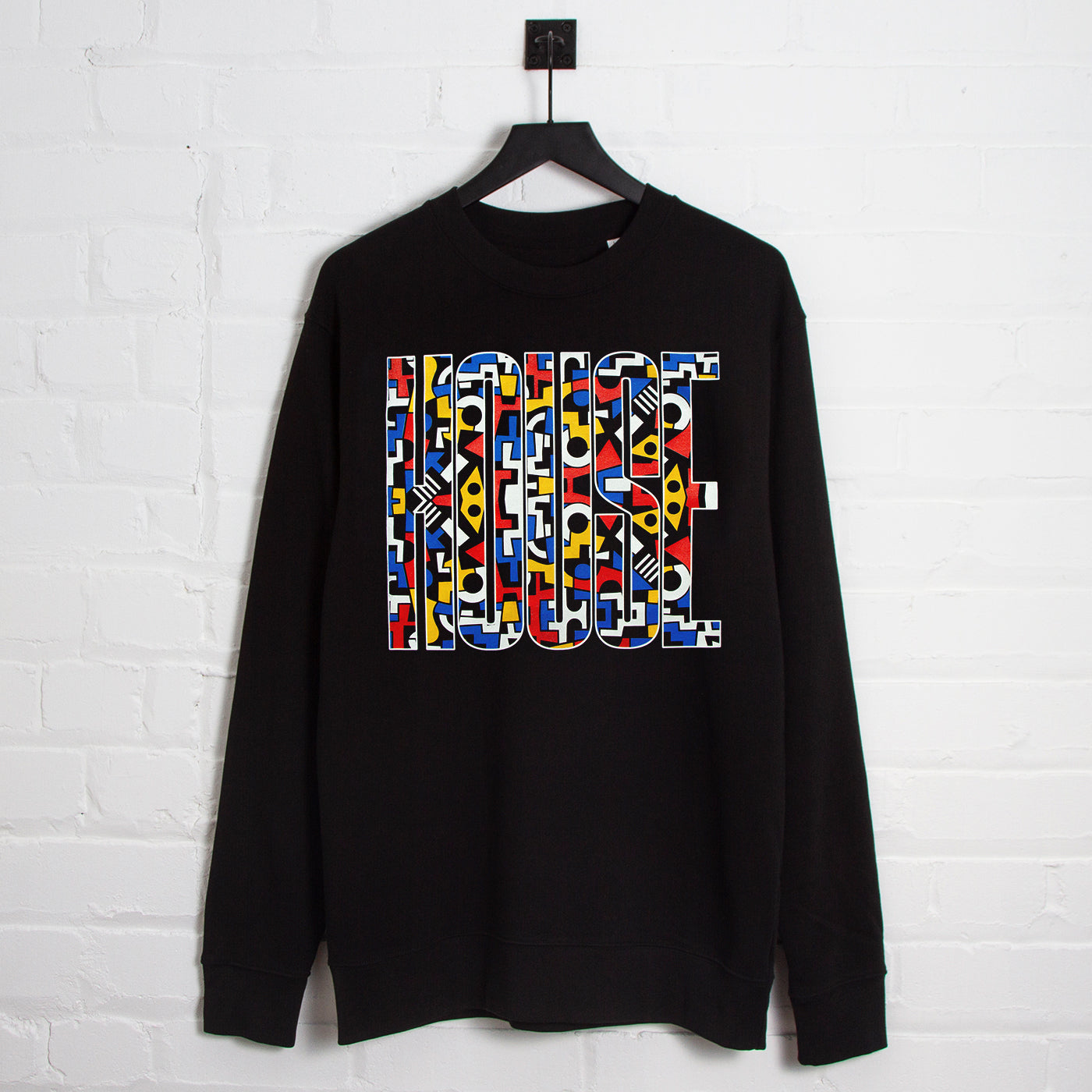 The Higher House design has been remixed with playful, colourful, and energetic shapes. Gotta have House, music, all night long. Large back print graphic with small front crest. Printed in-house by us on a unisex heavy-weight 100% Organic Cotton sweatshirt (350gsm).