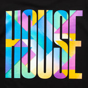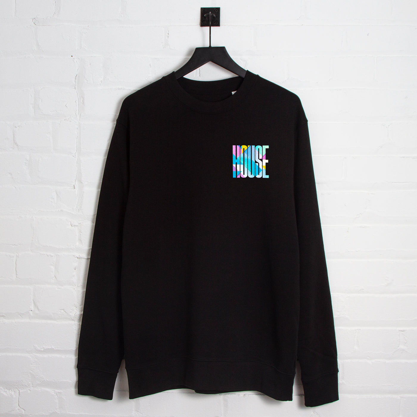 House Music All Night Long. The typography Higher House sweatshirt with retro triangle graphic fill. Large back print graphic with small front crest. Printed in-house by us on a unisex heavy-weight 100% Organic Cotton sweatshirt (350gsm).