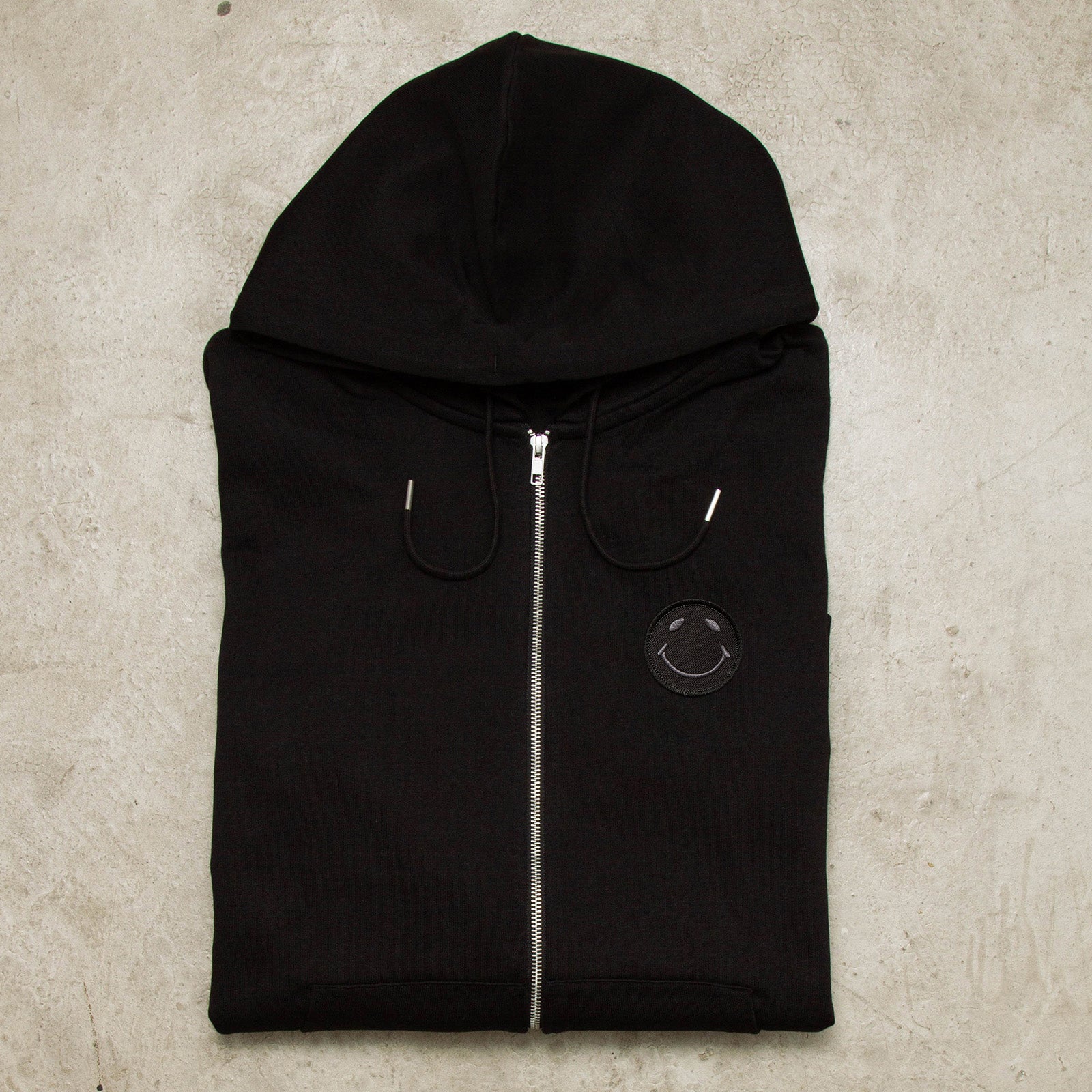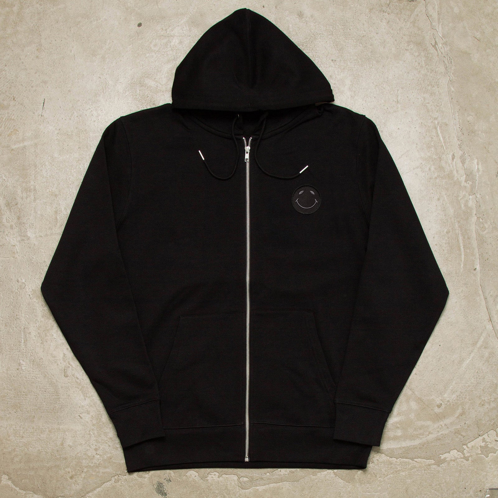 BLACK ON BLACK SMILEY CREST ZIPPED HOODIE
