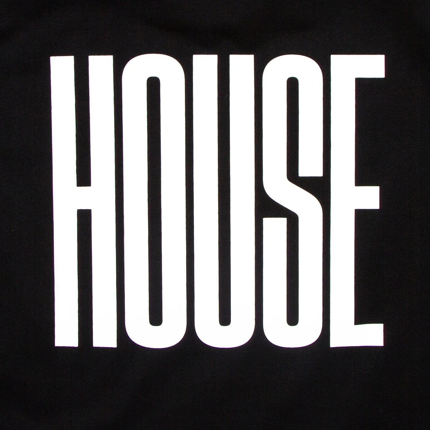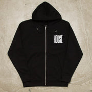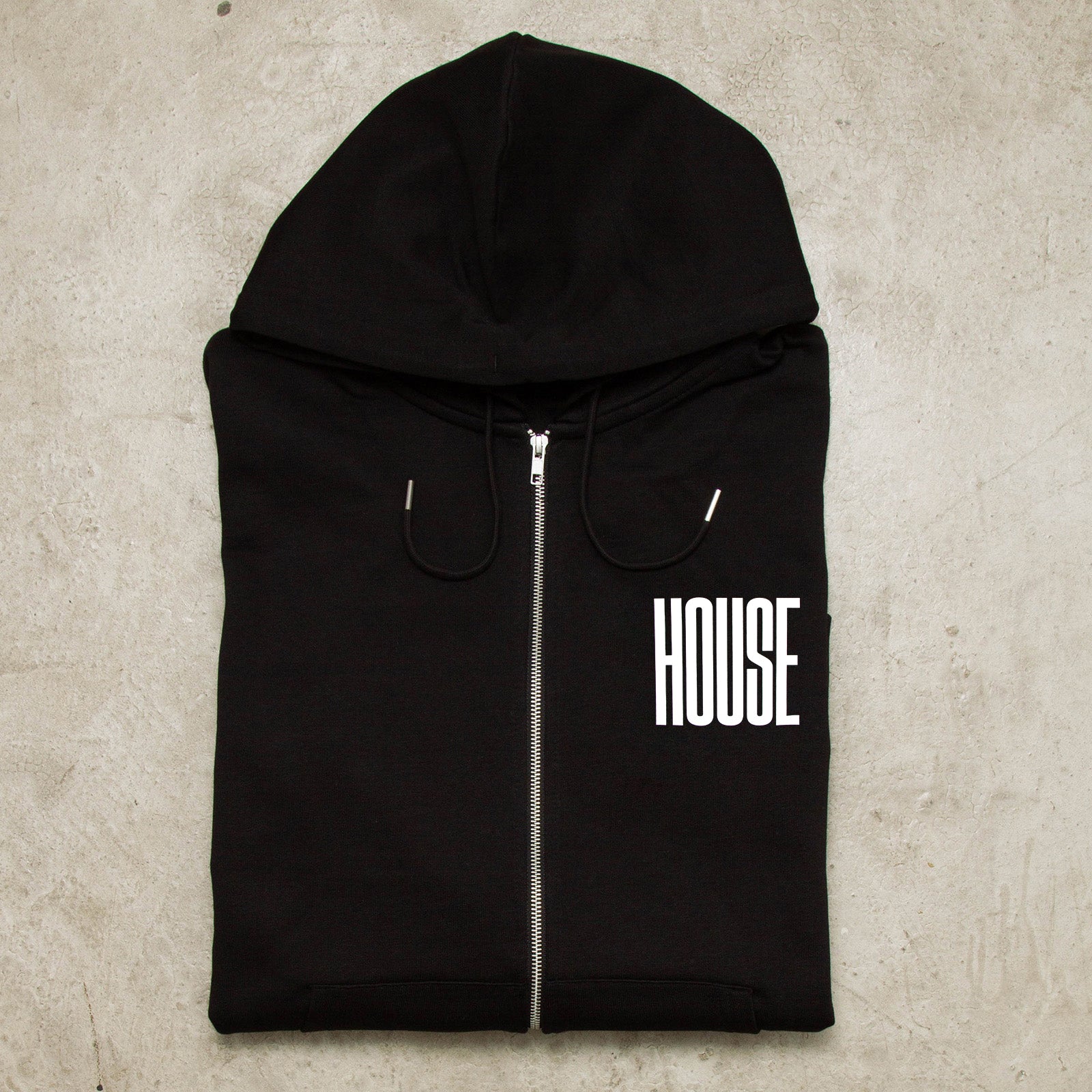 House Music All Night Long. The typography Higher House design. Screen-printed in-house by using using environmentally friendly water-based inks on an Organic Cotton 350GSM zipped hoodie.