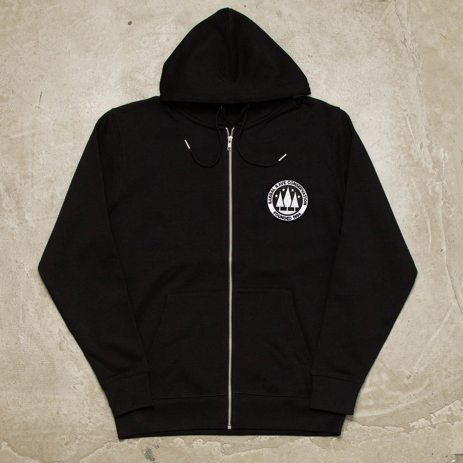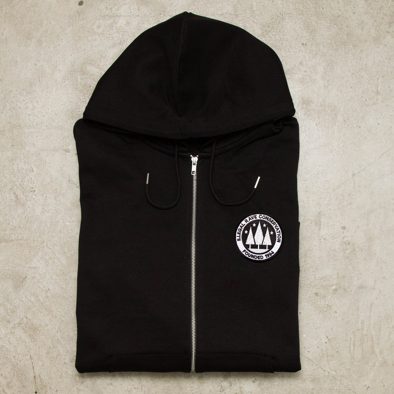 Layer up in our cosy zipped hoodies. Keeping it subtle with the embroidered Illegal Rave Conservation crest. Psychedelic Disco 1972 print. Organic Cotton. 350GSM