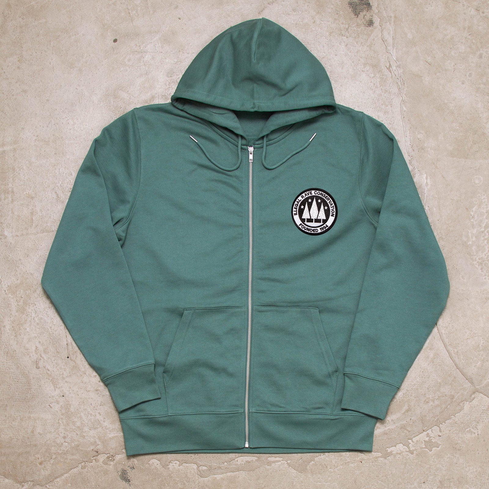 Layer up in our cosy zipped hoodies. Keeping it subtle with the embroidered Illegal Rave Conservation crest. Psychedelic Disco 1972 print. Organic Cotton. 350GSM