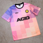 Our first ever custom pattern football jersey. The playa FC pixelated sunset was inspired by sunsets and beach vibes. Acid House, Disco Psychedelia, Techno and DNB sponsor choices. Plus choose between the Illegal Rave Conservation and Smiley team badge.
